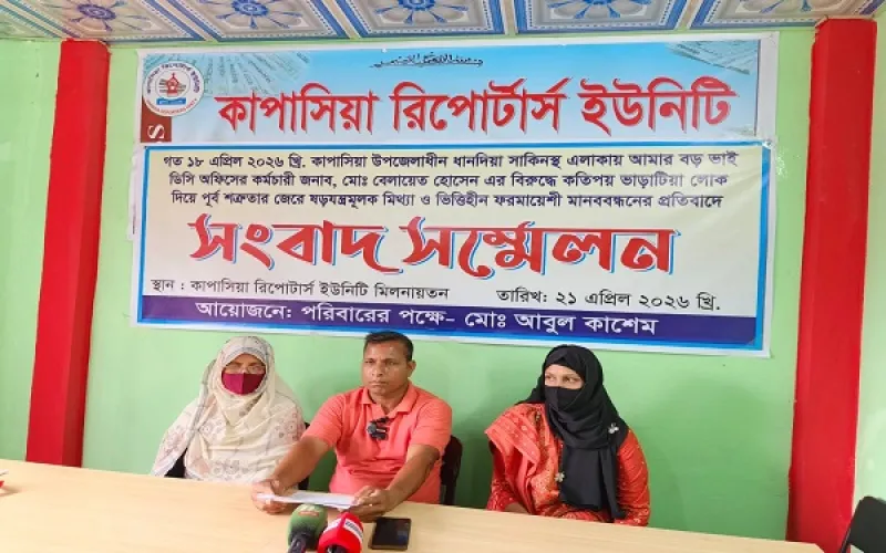 মঙ্গলবার (২১ এপ্রিল) কাপাসিয়া রিপোর্টার্স ইউনিটি কার্যালয়ে আয়োজিত এ সংবাদ সম্মেলনে লিখিত বক্তব্য পাঠ করেন আবুল কাশেম। তিনি উপজেলার সনমানিয়া ইউনিয়নের ধানদিয়া গ্রামের বাসিন্দা এবং ডিসি অফিসের কর্মচারী বেলায়েত হোসেনের ছোট ভাই।